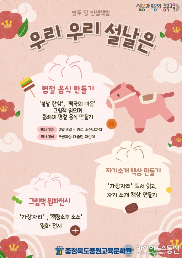 열두 달 인생책방 홍보물./사진제공=충북교육청 [아시아뉴스통신=장하영 기자] 충청북도교육청 직속기관 중원교육문화원(원장 신기철)은 언제나 책봄! 정책의 일환으로 3일(화)부터, 학생 학부모 및 지역주민을 대상으로 중원책누리도서관에서 <열두 달 인생책방>을 운영한다고 밝혔다. <열두 달 인생책방.. 2026-02-03