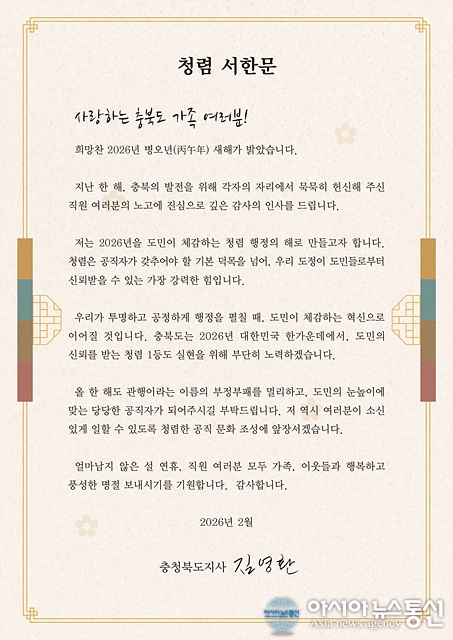 청렴 서한문./사진제공=충북도청 [아시아뉴스통신=장하영 기자] 김영환 충북도지사가 2026년 병오년(丙午年)을 ‘도민이 체감하는 청 렴 행정의 해’로 만들겠다는 의지를 담은 청렴서한문을 전 직원에게 발송하고, 올 한 해 청렴 실천을 당부했다. 김 지사는 청렴서한문을 통해 “청렴은 공직자가 갖.. 2026-02-03