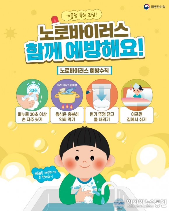 노로바이러스 감염증 예방수칙 홍보./사진제공=충북도청 [아시아뉴스통신=장하영 기자] 충북도는 겨울철 노로바이러스 감염증 발생이 증가함에 따라 도민들 에게 개인 위생수칙 준수를 당부했다. 질병관리청이 병원급 의료기관을 대상으로 운영하는 전국 장관감염증 표본감시 결과에 따르면, 노로바이러스 .. 2026-01-30