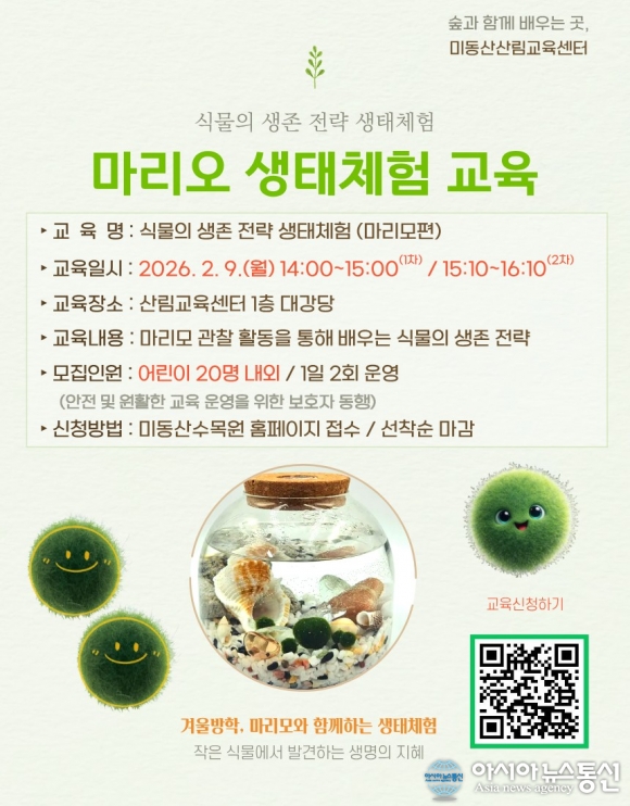 식물의 생존 전략 생태체험(마리모편)./사진제공=충북도청 [아시아뉴스통신=장하영 기자] 충청북도산림환경연구소(이하 연구소)는 겨울방학을 맞은 어린이를 대상으로 오는 2월 9일 미동산수목원 내 산림교육센터에서 「식물의 생존 전략 생태체험(마리모 편)」을 운영한다. 이번 프로그램은 추운 날씨로 야외.. 2026-01-30