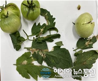 토마토뿔나방( 피해 잎과 과실)./사진제공=옥천군청 [아시아뉴스통신=장하영 기자] 옥천군농업기술센터(소장 유정용)는 시설 토마토 재배 농가를 대상으로 토마토뿔나방 발생 예찰과 적기 방제를 강화하고 있다고 밝혔다. 토마토뿔나방은 잎과 줄기, 과실 내부까지 가해하는 외래 돌발해충으로, 고온기 시설하.. 2026-01-30