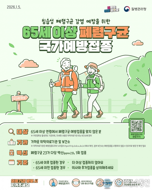 폐렴구균 무료 예방접종 포스터./사진제공=옥천군청 [아시아뉴스통신=장하영 기자] 옥천군은 65세 이상(1961년 12월 31일 이전 출생자) 어르신을 대상으로 ‘폐렴구균 무료 예방접종’을 실시한다고 밝혔다. 통계청 2023년 사망원인 통계에 따르면 폐렴은 암, 심장질환에 이어 국내 사망원인 3위를 차지하고 .. 2026-01-30