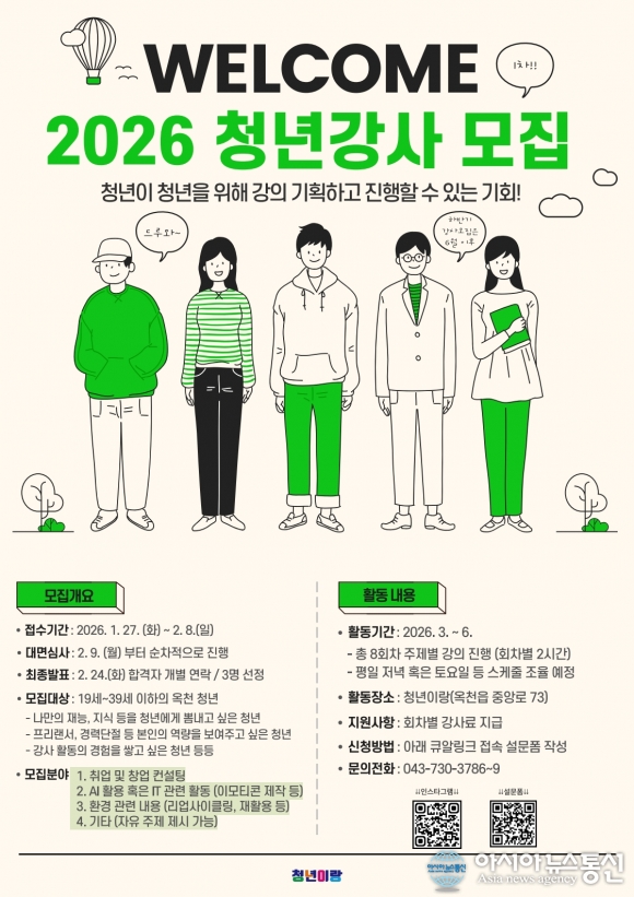 2026년 청년 강사모집 포스터./사진제공=옥천군청 [아시아뉴스통신=장하영 기자] 옥천군은 청년의 자율적 참여 확대와 정책 접근성 제고를 위해 청년센터‘청년이랑’을 중심으로 2026년 청년 참여형 프로그램을 본격 운영한다고 밝혔다. 2026년 청년이랑에서는 ▲ 청년 참여형 주도 클래스, ▲ 청년이랑 밥.. 2026-01-28