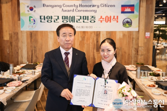 단양군 명예군민증 수여식./사진제공=단양군청 [아시아뉴스통신=장하영 기자] 단양군은 제1회 단양 겨울놀이 축제 기간에 맞춰 주한 캄보디아 대사와 캄보디아 관광부 차관·국장을 비롯한 고위급 대표단 40여 명이 단양을 방문했다고 밝혔다. 이번 방문은 양국 간 관광·문화 분야 교류 협력 확대와 상.. 2026-01-28