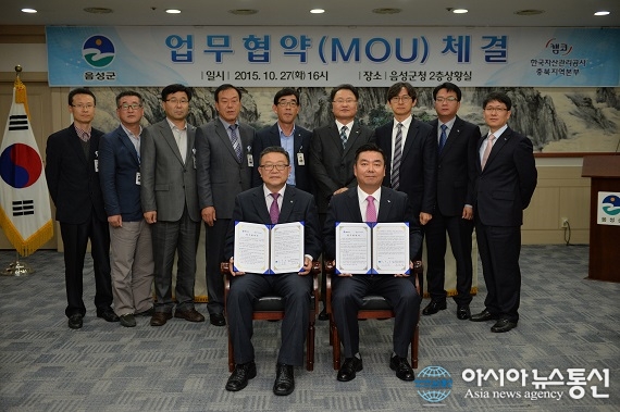 27일 충북 음성군과 캠코(한국자산관리공사)충북지역본부는 음성군청에서 지역경제 활성화를 위한 업무협약을 체결했다, 협약식 후 이필용 군수(앞줄 왼쪽)와 류재명 캠코 충북본부장(앞줄 왼쪽 두번째)을 비롯한 양 기관 관계자들이 기념촬영을 하고 있다.(사진제공=캠코충북본부) .. 2015-10-27