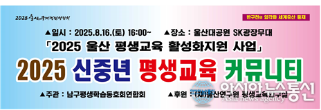 (사진제공:남구평생학습동호회연합) 16일 울산대공원 SK공연장에서 진행될 남구평생학습동호회연합회 2025 신중년 평생교육 커뮤니티 알림 현수막 [아시아뉴스통신=주영곤 기자] 16일 울산대공원 SK광장 야외공연장에서 울산남구평생 학습동호회연합회(남평연)이 주관하는 2025 신중년 평생교육 커뮤니티가 6개 동.. 2025-08-15