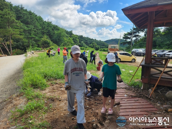 지난 15일 수해로 피해를 입은 충남 예산 오름직한동산에 임하규(순천승남중 1학년), 임하리(순천외서초 3학년) 선사모 회원이 방문해 수해복구 봉사를 진행하고 있다./아시아뉴스통신=윤자희 기자 2025-08-25