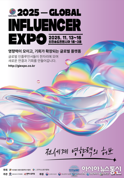 글로벌 인플루언서 엑스포 2025 포스터 [아시아뉴스통신=박성근 기자] 국내 최초의 글로벌 인플루언서 산업 전문 박람회인 ‘글로벌인플루언서엑스포 2025’가 오는 11월 13일부터 16일까지 인천 송도컨벤시아에서 개최된다. 지난해 첫 회를 성황리에 마친 본 행사는, 올해 ‘커머스 대전’을 주제로 실.. 2025-09-06