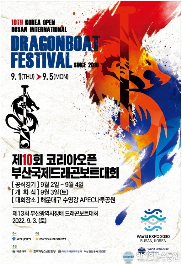 부산국제드래곤보트대회(자료제공=부산시청) [아시아뉴스통신=한주성 기자] 부산시(시장 박형준)는 오는 9월 1일부터 5일까지 「제10회 코리아오픈부산국제드래곤보트대회」와「제13회 부산광역시장배드래곤보트대회」를 수영강APEC 나루공원 일원에서 개최한다고 밝혔다. 드래곤보트는 뱃머리와 꼬리 부분.. 2022-08-30