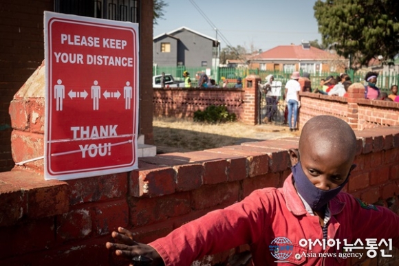 남아프리카공화국 요하네스버그에서 한 어린이는 줄을 서서 음식을 받는 시민들에게 안전거리를 유지하라고 주의를 주는 모습/(신화통신/아시아뉴스통신DB) [아시아뉴스통신=장희연 기자] 남아프리카공화국 코로나19, 10일 오전 9시 기준으로 확진자는 3,688,423명이고, 사망자는 99,656명이다. 전일대비 코로나19 확.. 2022-03-10
