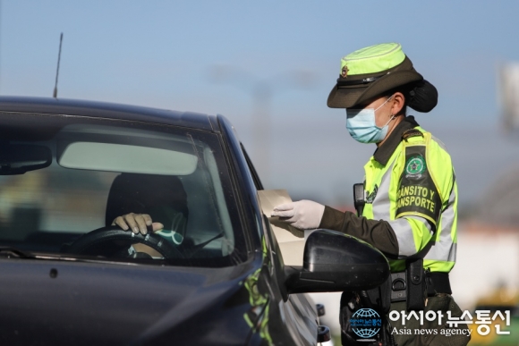 한 콜롬비아 경찰관이 운전자에게 차량 운행 사유를 묻고 면허증을 확인하고 있다. 코로나19 3차 대유행을 막기 위해 산타페데보고타는 전국민 격리를 실시하고, 불필요한 유동을 금지한다.(신화통신/아시아뉴스통신DB) [아시아뉴스통신=장희연 기자] 콜롬비아 코로나19, 10일 오전 9시 기준으로 확진자는 6,074,155명.. 2022-03-10