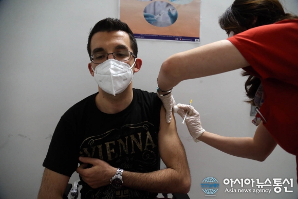 터키 앙카라에서 한 남성이 코로나19 백신 접종을 하고 있는 모습 /(신화통신/아시아뉴스통신DB) [아시아뉴스통신=장희연 기자] 터키 코로나19, 10일 오전 9시 기준으로 확진자는 14,458,881명이고, 사망자는 95,954명이다. 전일대비 코로나19 확진자 70,650명, 사망자 273명이 증가했다. gywhqh159@naver.com 2022-03-10