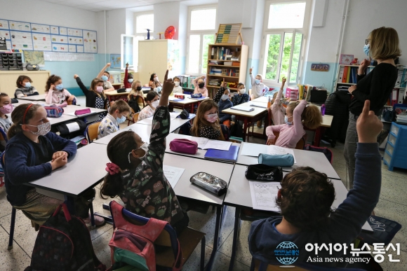 프랑스 남부 앙티브의 한 초등학교 어린이들의 모습/(신화통신/아시아뉴스통신DB) [아시아뉴스통신=장희연 기자] 프랑스 코로나19, 10일 오전 9시 기준으로 확진자는 22,599,739명이고, 사망자는 136,701명이다. 전일대비 코로나19 확진자 148,974명, 사망자 303명이 증가했다. gywhqh159@naver.com 2022-03-10