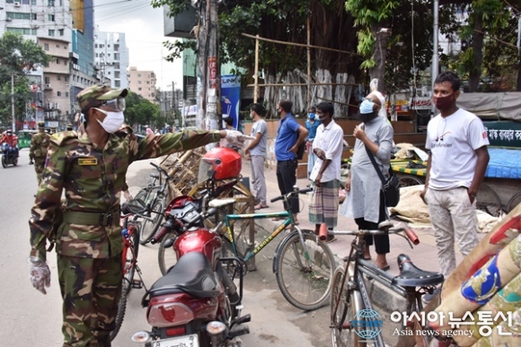방글라데시의 수도 다카에서 군인들은 사람들에게 사교적인 거리를 유지하라고 촉구하는 모습 /(신화통신/아시아뉴스토신DB) [아시아뉴스통신=장희연 기자] 방글라데시 코로나19, 10일 오전 9시 기준으로 확진자는 1,948,471명이고, 사망자는 29,097명이다. 전일대비 코로나19 확진자 769명, 사망자 8명이 증가했다. gywh.. 2022-03-10
