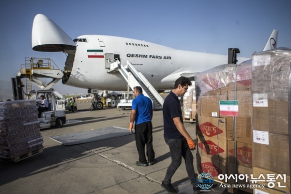 이란 테헤르에서 요원들이 람마흐라바드 공항에는 구호물자가 실려 있는 모습 /(신화통신/아시아뉴스통DB) [아시아뉴스통신=장희연 기자] 이란 코로나19, 10일 오전 9시 기준으로 확진자는 7,107,167명이고, 사망자는 138,433명이다. 전일대비 코로나19 확진자 10,849명, 사망자 317명이 증가했다. gywhqh159@naver.com 2022-03-10