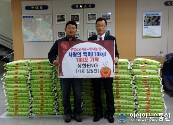 11일 김원진 삼한ENG 대표가 연말을 맞아 어려운 이웃들에게 전해달라며 ‘사랑의 쌀’을 창원시 성산구 윤종식 반송동장에게 전달하고 있다.(사진제공=창원시청)