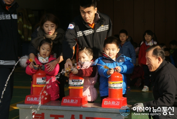 지난 11일 인천공단소방서 고잔119안전센터가 소방서를 방문한 현대유치원 원생 및 교사 60여명을 대상으로 화재 및 각종 안전사고 대비 어린이 소방안전체험을 실시했다. 사진은 물소화기 체험을 하는 모습.(사진제공=인천공단소방서)