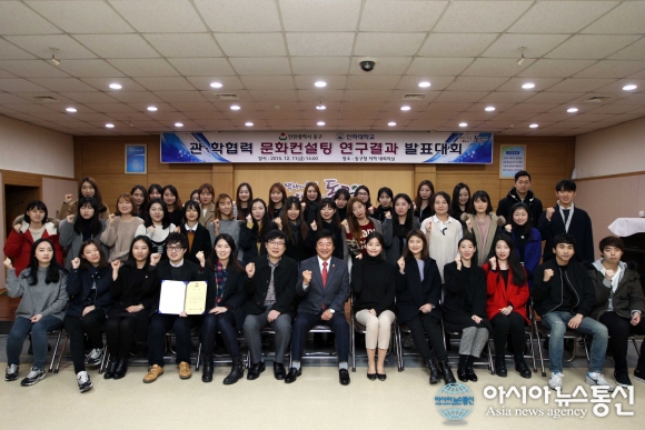 지난 11일 인천시 동구가 구청 대회의실에서 인하대학생과 직원 등 90여 명이 참석한 가운데 2015 관․학협력 문화컨설팅 연구결과 발표대회를 진행하고 기념촬영을 하고 있다.(사진제공=인천동구청)