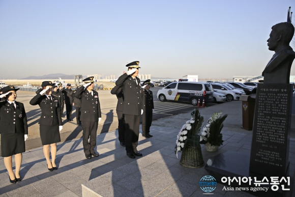 12일 인천해경서가 지난 2011년 불법조업 중국어선 단속 중 순직한 故 이청호 경사 4주기 추모식을 인천해경 함정전용부두와 월미공원에 세워진 故 이청호 경사의 흉상에서 진행하고 있다.(사진제공=인천해양경비안전서)