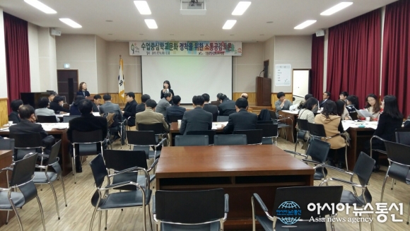 지난 10일 인천강화교육지원청이 관내 유, 초, 중학교 교장과 행정실장을 대상으로 수업중심 학교문화 정착을 위한 행정업무 최적화 방안 마련을 위한 나눔토론회를 진행하고 있다.(사진제공=인천강화교육지원청)