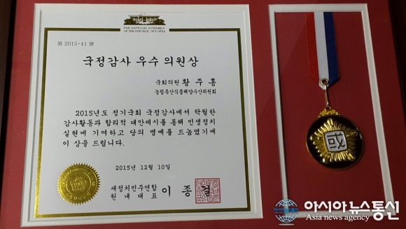 ' 새정치민주연합 '국정감사 우수의원상’ 수상자로 선종돼 올해 ‘국감 10관왕’ 영예 안은 황주홍(전남 장흥 영암 강진) 의원 상장 내용.(사진제공=황주홍의원실)