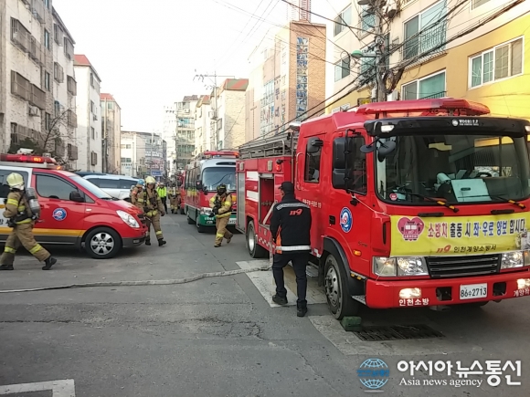 지난 9일 인천계양소방서가 화재위험이 많은 겨울철 신속한 현장대응능력 향상을 위해 계산동, 병방동, 박촌동 일원 도시형 생활주택 출동장애지역에 대한 불시 출동훈련을 진행하고 있다.(사진제공=인천계양소방서)
