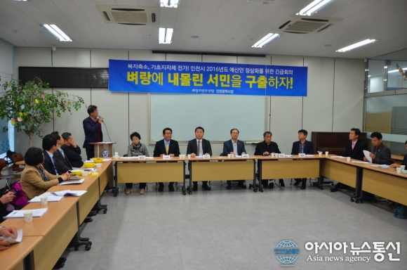 지난 11일 새정치민주연합 인천시당이 YWCA건물 1층 민들레홀에서 새정치민주연합 인천시당 소속 구청장·시구의원 연석 간담회를 갖고 유정복 시장이 편성한 복지축소, 토건공약 남발 다음해 인천시 예산안 편성을 규탄키로 결의하고 ..