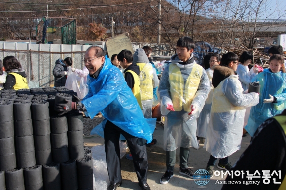 12일 푸르미가족봉사단이 인천시 연수구 동춘동 소암마을에서 사랑의 연탄 나눔 운동을 진행하고 있다. 사진은 황우여 교육부 장관(왼쪽)이 학생들과 연탄을 배달하고 있는 모습.(사진제공=푸르미가족봉사단)