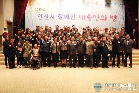지난 11일 오후 한양대 게스트하우스 3층 연회장에서 안산시 장애인체육 발전을 위해 노력하는 장애체육인과 축하 내빈 등 250여명이 참석한 가운데‘2015 안산시 장애인 체육인의 밤'행사가 성황리에 마치고 단체 기념사진을 촬영했..