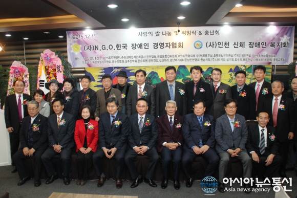 지난 11일 사단법인 N.G.O.한국장애인 경영자협회가 제2대 신태균 인천시지부장 취임식 및 '2015년 송년의 밤' 행사를 열고 기념촬영을 하고 있다./아시아뉴스통신=이명기 기자