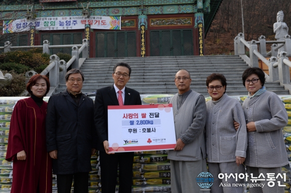 지난 11일 인천시 연수구 옥련동 청량산에 위치한 호불사가 인천사회복지공동모금회를 통해 사랑의 쌀 2800kg을 연수구청에 기부하고 이재호 인천연수구청장(왼쪽에서 세번째)과 기념촬영을 하고 있다.(사진제공=인천연수구청)