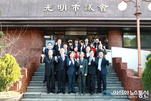 지난 11일 나상성 광명시의회 의장과 광명 청년회의소와 교류를 위해 한국을 방문한 대만 앵가시 청년상회(앵가JC) 방문단이 상호 관심사항 대해 의견을 교환하고 있다.(사진제공=광명시의회)