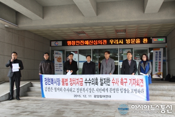 광양시청사 입구에서 문성필 광양참여연대 사무국장(왼쪽)의 진행으로 정 시장의 불법정치자금 수수의혹 관련해 검찰은 한 점 의혹 없이 철저히 수사하라는 기자회견을 하고 있다./아시아뉴스통신=조용호 기자