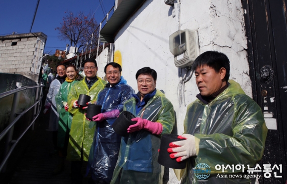 권선택 대전시장은 주말인 12일 오전 문화체육 관련 기관·단체장, 임직원 및 시 문화체육관광국 공무원 등 200여명과 연탄을 배달하고 있다. 이들은 동구 천동 취약계층 15세대에 3800장의 연탄을 배달했다.(사진제공=대전시청)
