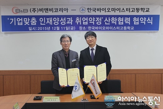 지난 11일 한국바이오마이스터고등학교(교장 최유호.왼쪽)는 (주)비앤비코리아(대표 윤한별)와 인재 육성 및 취업약정을 위한 산학협력 협약을 맺었다.(사진제공=충북도교육청)