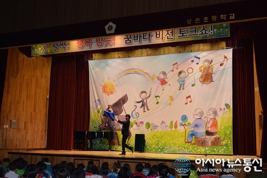 지난 11일 충북 영동 상촌초등학교(교장 최경희)는 상촌관에서 전교생과 교직원이 참석한 가운데 상촌초 45회 졸업생인 영동 이수초 박천호 교장을 초빙해 선배와의 대화시간을 가졌다. 사진은 박천호 교장이 자비를 들여 초청한 마술사..