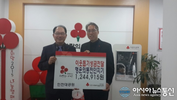 11일 인천시 동부공원사업소가 인천사회복지 공동모금회를 방문해 행운의 동전던지기 이벤트 모금액을 기부하고 기념촬영을 하고 있다.(사진제공=인천시동부공원사업소)