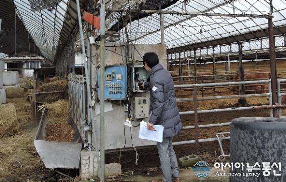 세종시가 겨울철 축산분야 재난 예방을 위해 오는 16일까지 노후축사를 대상으로 점검을 실시한다. 사진은 세종시 축사 재난차단 점검반이 노후축사를 찾아 전기 시설 정비 여부를 점검하는 모습.(사진제공=세종시청)