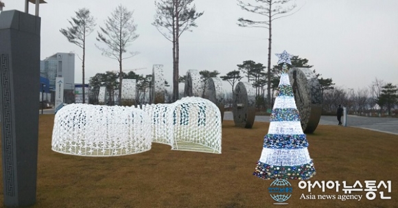 세종시청 앞 잔디광장에 크리스마스 트리와 ‘느림의 여정’이라는 주제로 목원대학교 건축학과 학생들이 만든 조형물이 설치됐다.(사진제공=세종시청)