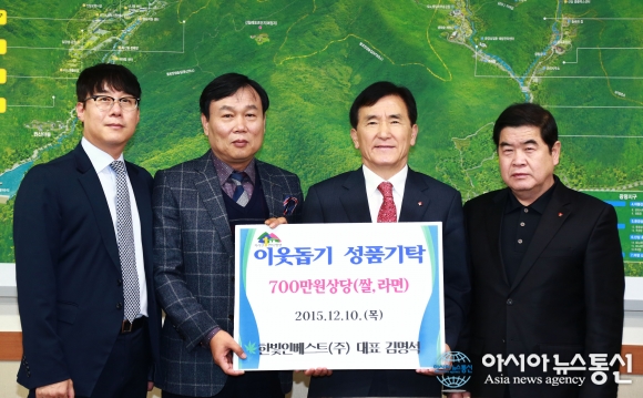 10일 경남 함양군 함양읍 죽림리 송전마을 출신 김명석 대표 등이 어려운 이웃에 지원해 달라며 쌀과 라면을 임창호 군수(가운데 오른쪽)에게 전달하고 있다.(사진제공=함양군청)
