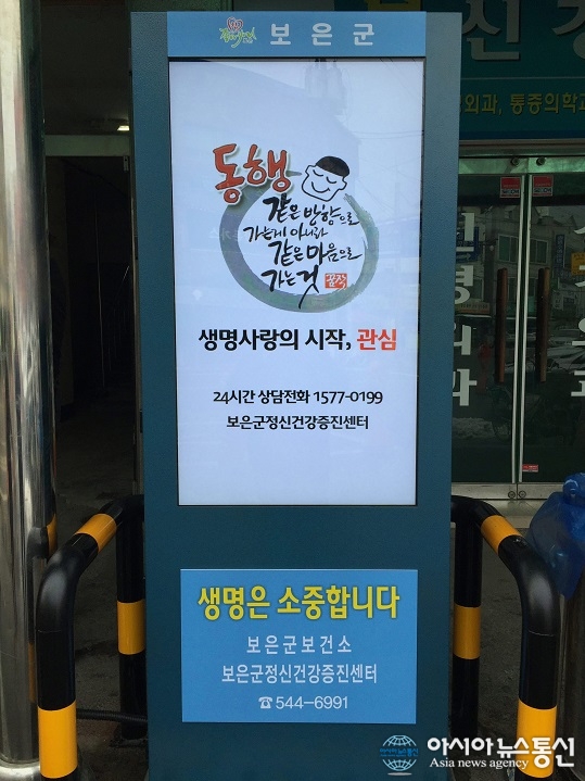 충북 보은군정신건강증진센터(임성진 센터장)가 생명존중문화 조성을 위해 보은한양병원 사거리에 설치한 자살예방 홍보전광판.(사진제공=보은군청)