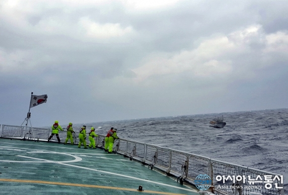 11일 오전 6시5분쯤 경북 포항해경 1510함이 영덕군 축산항 동방 15마일 해상에서 조업 중 선박 화재와 기관고장으로 표류하던 채낚기어선 B호(27톤 후포항선적, 승선원 11명)를 예인하기 위해 접근하고 있다. 승선원 11명과 B호는 이날 오후 8..