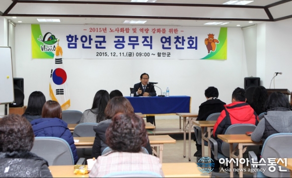 11일 경남 함안군은 산인면 소재 드윌연수원에서 공무직 직원 65명을 대상으로 노사화합과 역량강화를 위한 ‘2015 함안군 공무직 연찬회’를 가졌다.(사지제공=함안군청)