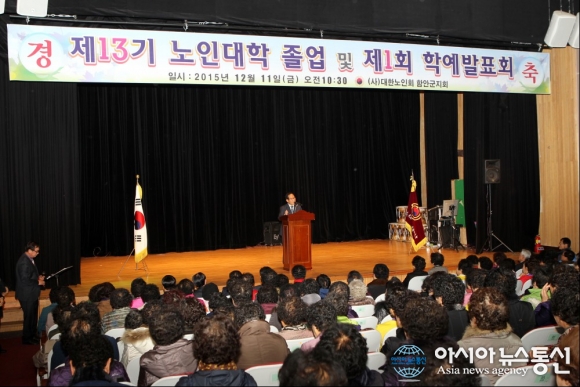 11일 경남 함안문화원 2층 대강당에서 차정섭 함안군수, 내빈, 노인대학 졸업생, 교양프로그램 수강생 등 250여명이 참석한 가운데 제13기 노인대학(학장 이영호) 졸업식이 열리고 있다.(사진제공=함안군청)