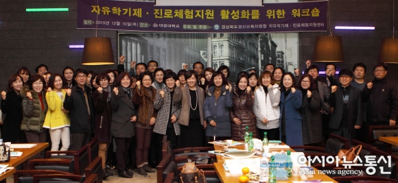 10일 이채영 대경대 총장과 워크샵에 참여한 교사들이 자유학기제 파이팅을 외치며 단체사진을 찍고 있다.(사진제공=대경대)