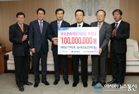 11일 경북도청에서 경북농협이 김관용 도지사가 참석한 가운데 (사)우리문화재찾기운동본부(회장 박영석)에 우리문화재찾기 운동 후원금 1억원을 전달한 후 기념촬영을 하고 있다.(사진제공=경북농협)