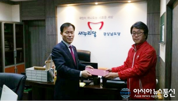10일 윤한홍 전 경상남도 행정부지사(왼쪽)가 새누리당 입당원서를 제출하고 있다.(사진제공=새누리당 경남도당)