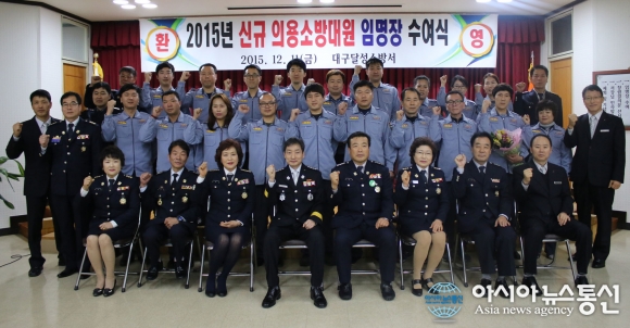 11일 달성소방서 회의실에서 열린 의용소방대 신규대원 임명장 수여식 후 소방공무원 및 의용소방대원들이 단체촬영을 하고 있다.(사진제공=달성소방서)