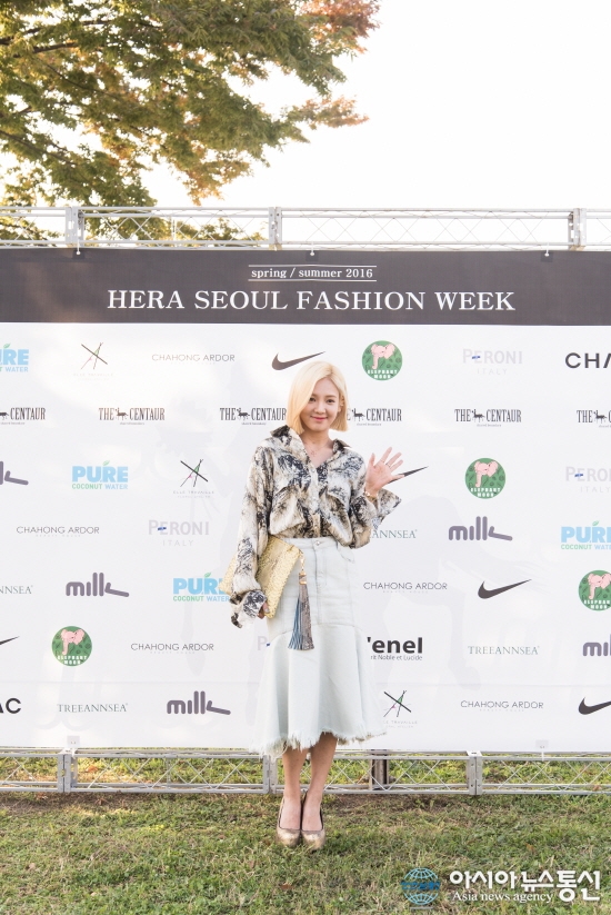 그룹 소녀시대 효연이 최근 서울 동작구 이촌 한강공원에서 열린 ‘2016 S/S 서울 패션위크’ 예란지 디자이너의 더센토르 ‘결혼하자’ 컬렉션에 참석해 포토월에서 기념 촬영..