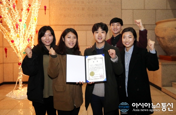'2015 나트륨 줄이기 UCC공모전'서 최우수상과 우수상을 수상한 계명대 학생들이 기념촬영을 하고 있다. 왼쪽부터 백유경, 홍재은, 이택은, 최한솔, 황지연 학생.(사진제공=계명대)